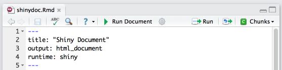 To create a new interactive document open the New R Markdown dialog in RStudio and choose to create a document with the “Shiny Document” template:
