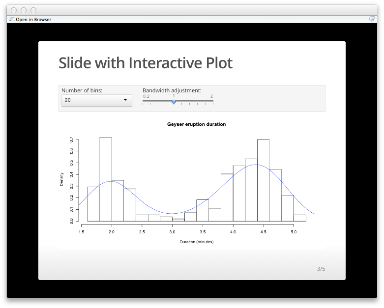 R Markdown leverages Shiny at its core to make this possible. Here is a simple example of an R Markdown document with an interactive plot: